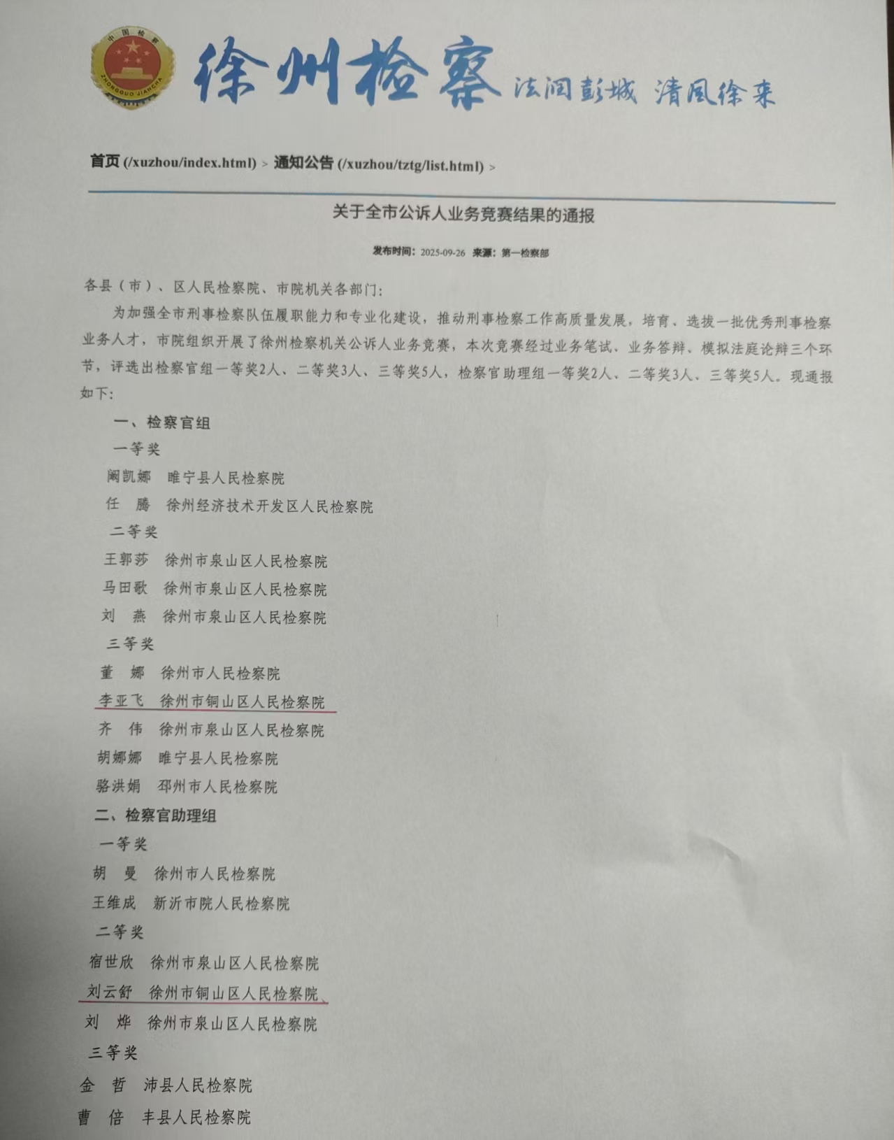 9月23日至25日,徐州市检察院举办全市检察机关公诉人业务竞赛。9月25日下午,竞赛隆重落幕。经过近三天的激烈角逐,铜山区检察院第二检察部检察官李亚飞、第一检察部检察官助理刘云舒以优异成绩分别荣获检察官组三等奖、检察官助理组二等奖,展现出该院青年干警朝气蓬勃、奋力争先的良好精神风貌。