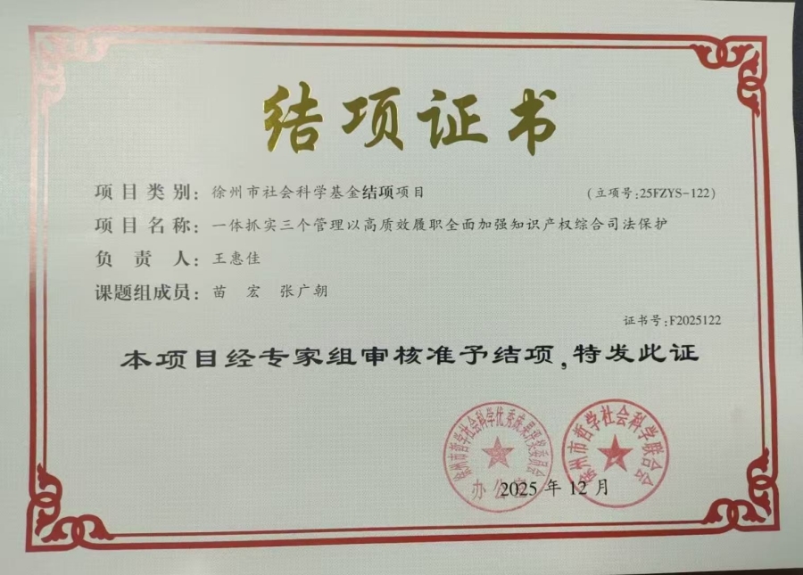 近日,由铜山区检察院申报的2025年度徐州市社会科学基金项目——《一体抓实三个管理以高质效履职全面加强知识产权综合司法保护》顺利通过专家组审核,准予结项。